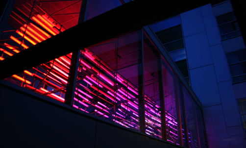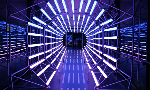 Idea: We decided to build a tunnel out of the light tubes that the visitor is a part of the installation. The topic time gave us the idea to animate the four seasons with colour, images and sound.